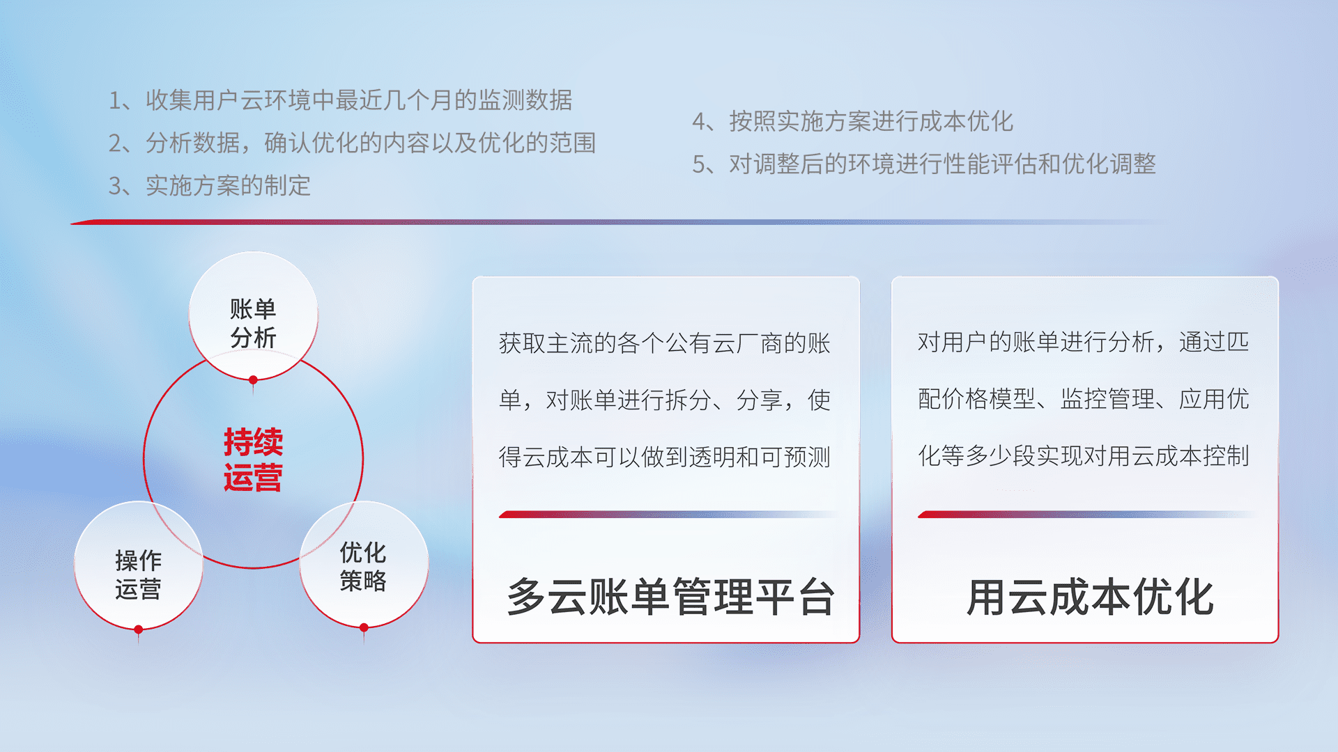通过多云纳管,,,以统一的资源数据模型把客户的云资源进行抽象和封装,,,,进而实现对多云资源的统一操作,,,,保障云资源管理的可靠性、、稳定性与可用性。。量身定制化运维内容,,配置、、、、开发运维、、、补丁管理、、、备份、、监控、、认证和访问管理、、审计和日常巡检等,,保障在用云过程中的可靠度,,稳定度以及高可用率。。。。